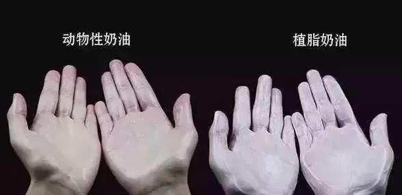 手搓法:取動(dòng)物奶油、植物奶油分別涂于掌心,進(jìn)行揉搓。結(jié)果動(dòng)物奶油很快消失在掌心,手掌內(nèi)只剩余少量油脂,像涂了護(hù)手霜。